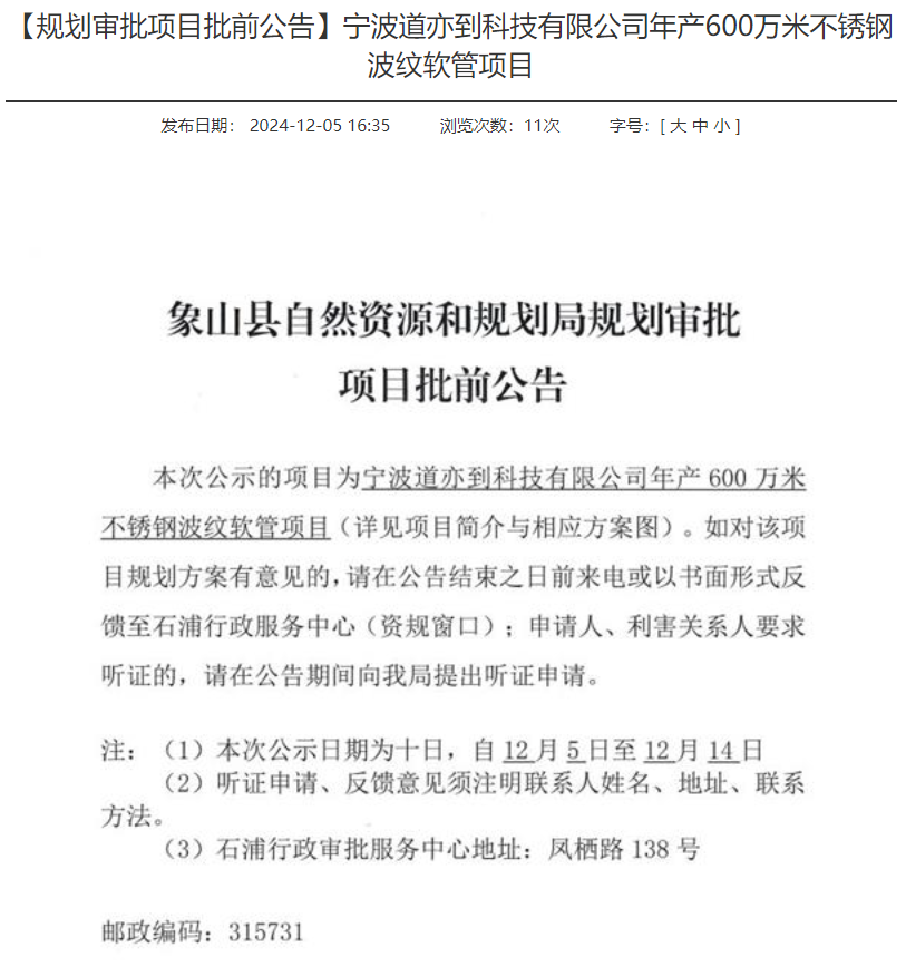 寧波道亦到年產(chǎn)600萬米不銹鋼波紋軟管項(xiàng)目規(guī)劃審批項(xiàng)目獲批前公告