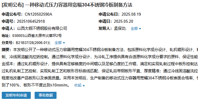 山西太鋼申請一種移動式壓力容器用寬幅304不銹鋼冷板制備方法專利